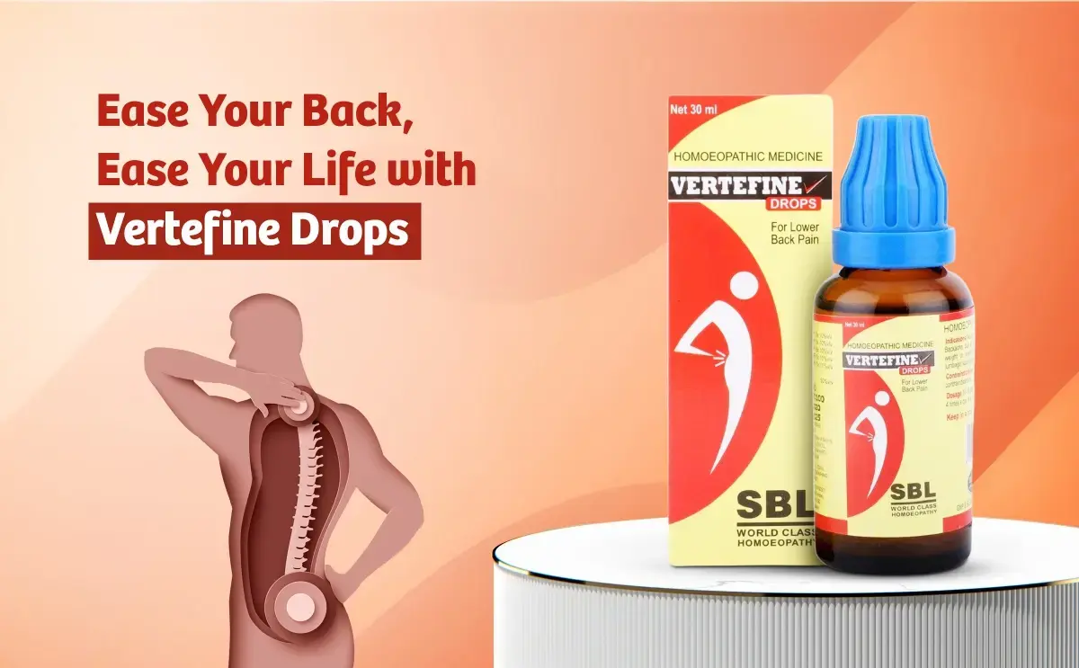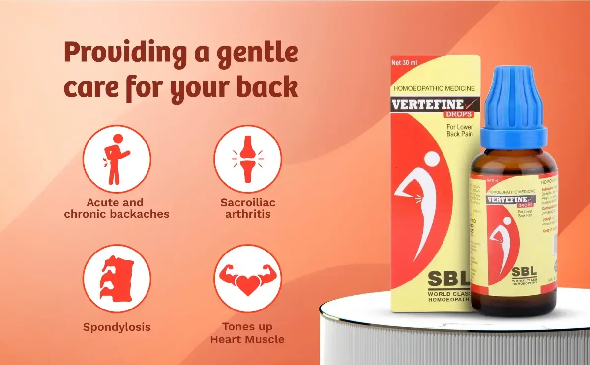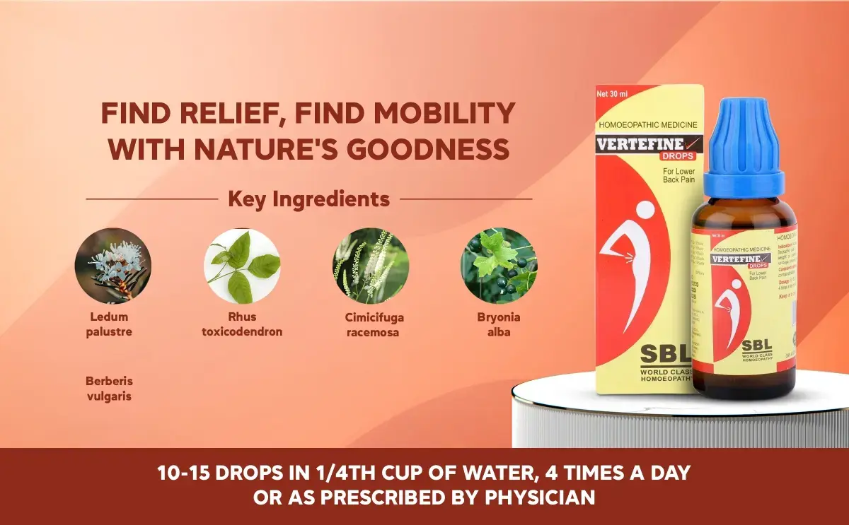 SBL’s Vertefine Drops is a well balanced composition of homoeopathic medicines that treats lumbago speedily thereby relieving the pain and discomfort. Vertefine improves mobility and flexibility in the body which helps to treat severe pain and spasms in lower back, backache with stiffness, spondylosis, tingling & numbness in the back, buttocks or down along one or both legs. It has no known contra-indication.