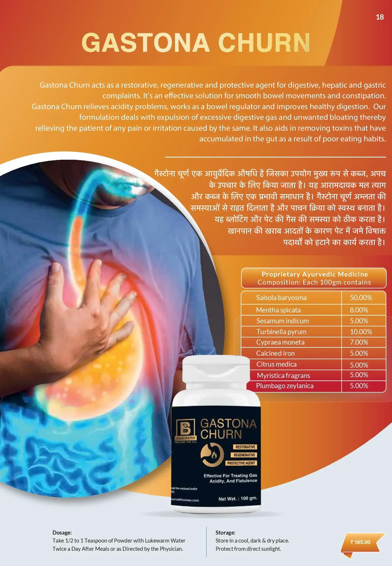 Gastona Churn acts as a restorative, regenerative and protective agent for digestive, hepatic and gastric complaints. It’s an effective solution for smooth bowel movements and constipation. Gastona Churn relieves acidity problems, works as a bowel regulator and improves healthy digestion.